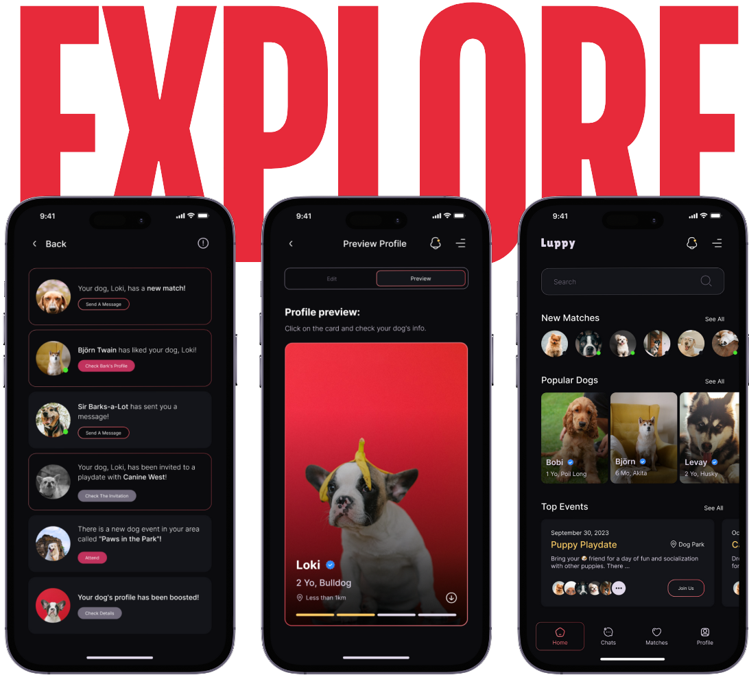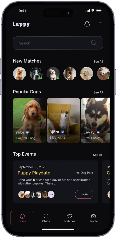 We've built this app to maximize the ways you can find perfect matches for your dog. From setting up playdates to building lasting friendships, LUPPY makes everything exciting on an entirely different level.